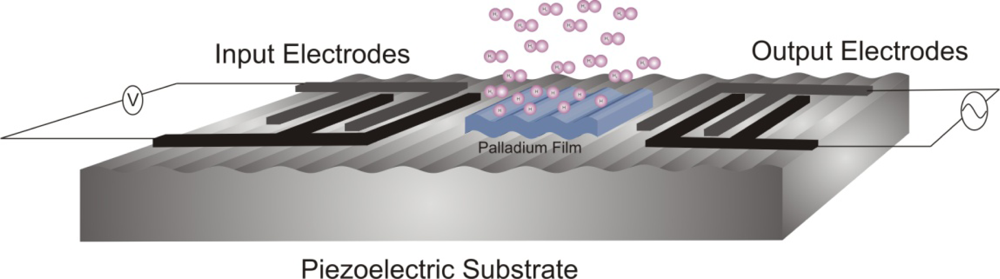 Various sensing mechanisms are adopted for hydrogen detection. D’Amico and Zemel [] used pyroelectric sensors incorporating palladium electrodes for hydrogen detection. Hydrogen absorption causes heat generation, which affects the output voltage signal. Butler [] used optical fiber sensors with palladium coated quartz fibers. Hydrogen absorption causes stretching of the optical fiber, which changes its optical length. Kumar [] used an electrochemical cell where the potential difference between the two electrodes was used as an indicator of hydrogen detection. Cabrera [] monitored the change in resistivity of thin Pd films due to hydrogen exposure at different hydrogen pressures. Resistivity increased during hydrogen exposure and then decreased to its initial value when hydrogen was removed from the chamber. In addition, it was found that if resistance measurements at a constant film temperature are made, the hydrogen concentration in the Pd film can be determined. Łukaszewski [] used a Quartz Crystal Microbalance (QCM) for hydrogen detection. The QCM was coated with several films of pure Pd and Pd alloys. The frequency shift in each case was used as an indicator of hydrogen detection. QCM and SAW sensors have closely related operating principles, however SAW sensors offer increased sensitivity because they can operate at much higher frequencies []. As the operating frequency of SAW sensors increases the wave becomes more confined near the surface and therefore more sensitive to changes in the adjacent environment. There are various studies in the literature for the use of SAW technology for hydrogen detection [,–].