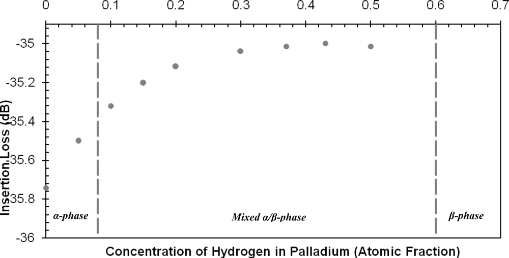 The results of the current simulation in Figure 9 follow the same trend as that of Jakubik et al. The data points in both figures are fitted with a cubic polynomial function and in both cases the R2 value is above 0.97. The changing properties of the palladium film due to hydrogen absorption also affect the attenuation of the SAW wave. The insertion loss values in Figure 10 illustrate that as the hydrogen concentration increases in the film the insertion loss values increase accordingly indicating less attenuation. The insertion loss values adopt a similar behavior to the change in wave velocity since the values continue to increase but with a smaller magnitude in the concentration range of 0.3–0.5 a.f. This result is expected because as mentioned earlier the formation of the β-phase softens the crystal and as the β-phase dominates the lattice, the properties of the Pd film continue to change but with a lower magnitude. These results of the normalized velocity and insertion loss indicate that the magnitude of the response of the SAW sensor increases with increasing hydrogen absorption in the Pd film then the magnitude decreases as the β-phase of palladium hydride dominates the lattice structure.