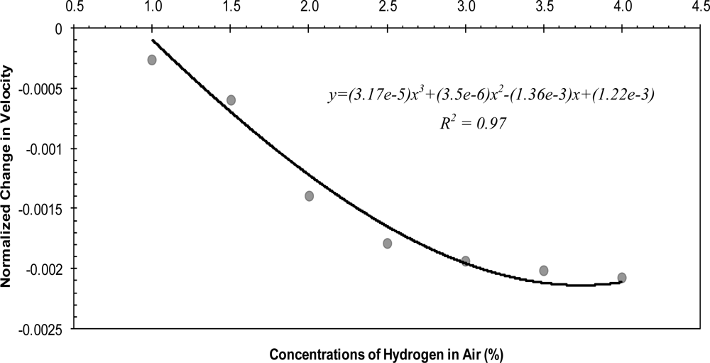 Normalized change in wave velocity at various H2 concentrations in air (volume %). Data is obtained from the frequency response values reported by Jakubik et al. [].