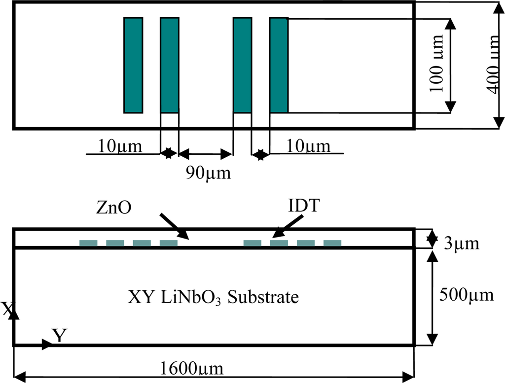Ippolito et al. [] provides both simulation and experimental results for a specific configuration of a SAW sensor. The same configuration is adopted in this study for verification of the FE model. The device consists of a layered piezoelectric substrate with interdigital electrodes patterned on the interface. The piezoelectric substrate is lithium niobate (LiNbO3) with XY orientation, indicating that the X-crystal axis is perpendicular to the surface of the substrate, meanwhile the Y-crystal axis is along the propagation direction. The surface of the LiNbO3 substrate is completely covered with a thin piezoelectric zinc oxide (ZnO) film. Figure 2 illustrates a schematic of the device configuration with the corresponding dimensions.