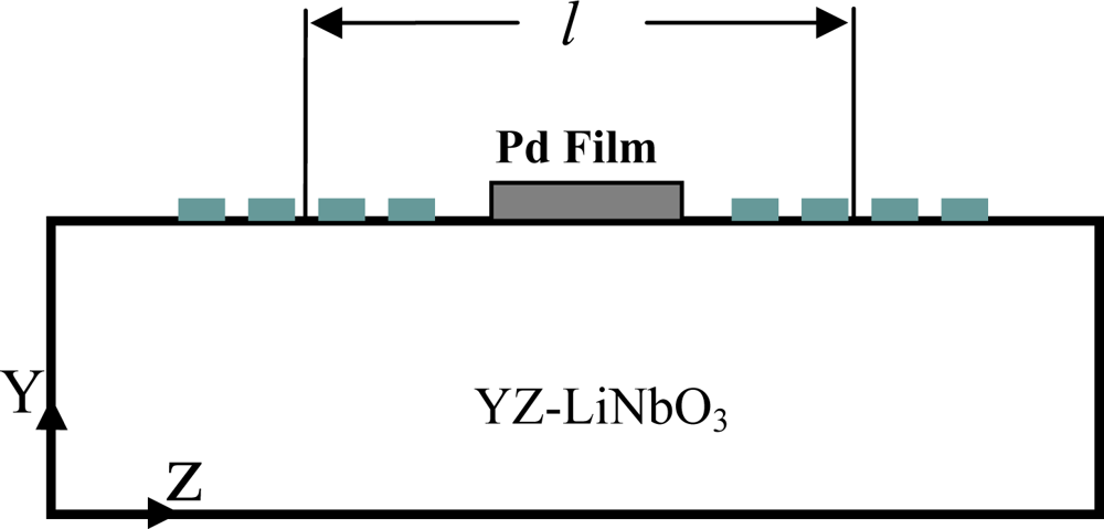 In this configuration a bare YZ-LiNbO3 substrate is used and a thin palladium layer is added between the two sets of IDT’s as shown in Figure 5.