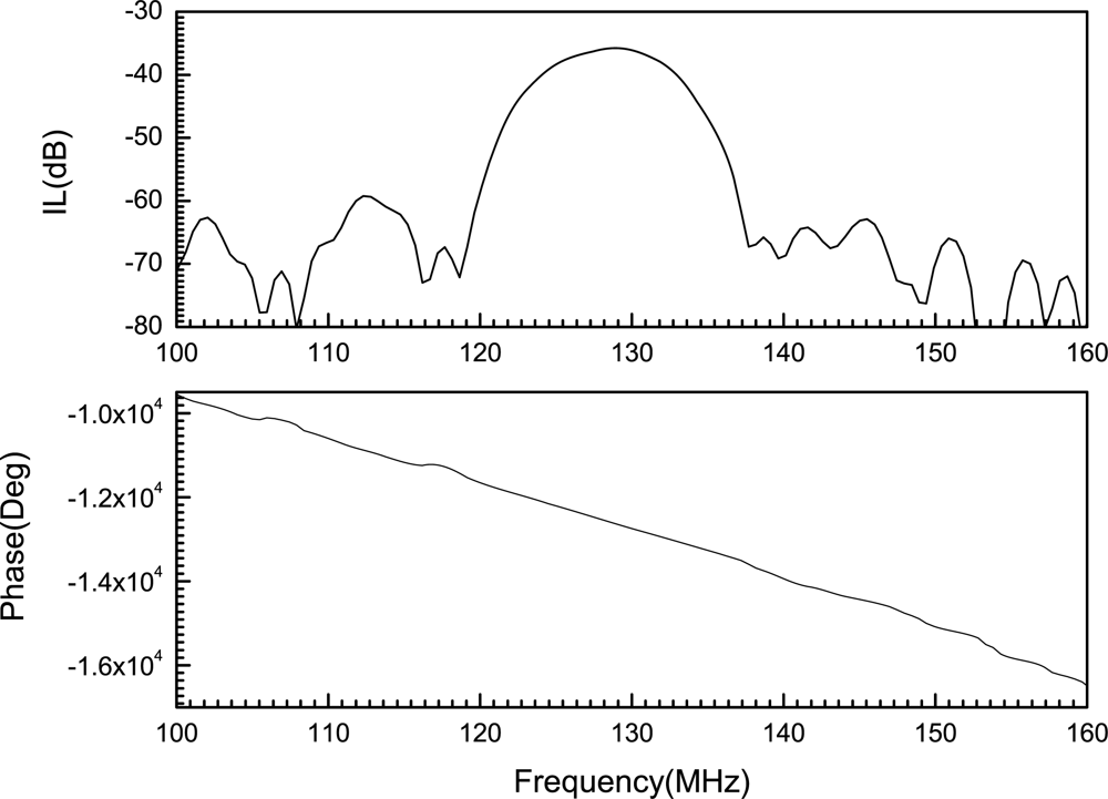 where Ts is the time step size set to 1 ns. The simulation time is 100 ns. The frequency response is determined from the Fourier transform of the impulse response. Table 3 lists the results of the current simulation in comparison with the results from Ippolito et al. []. As can be clearly seen, results of the current simulation agree very well with both the simulation and experimental values. In the current simulation the center frequency value is 100.56 MHz, however the center frequency in the experimental result is 103 MHz. The 3 MHz variation is due to the tolerance involved in fabricating the electrodes using lithographic techniques. The insertion loss value in the current simulation is −35.5 dB, which more closely matches the experimental value of −34.3 dB than the simulation value of −37.5 dB by Ippolito et al.