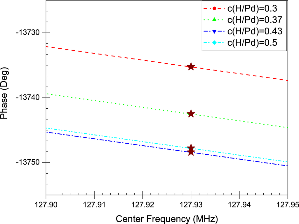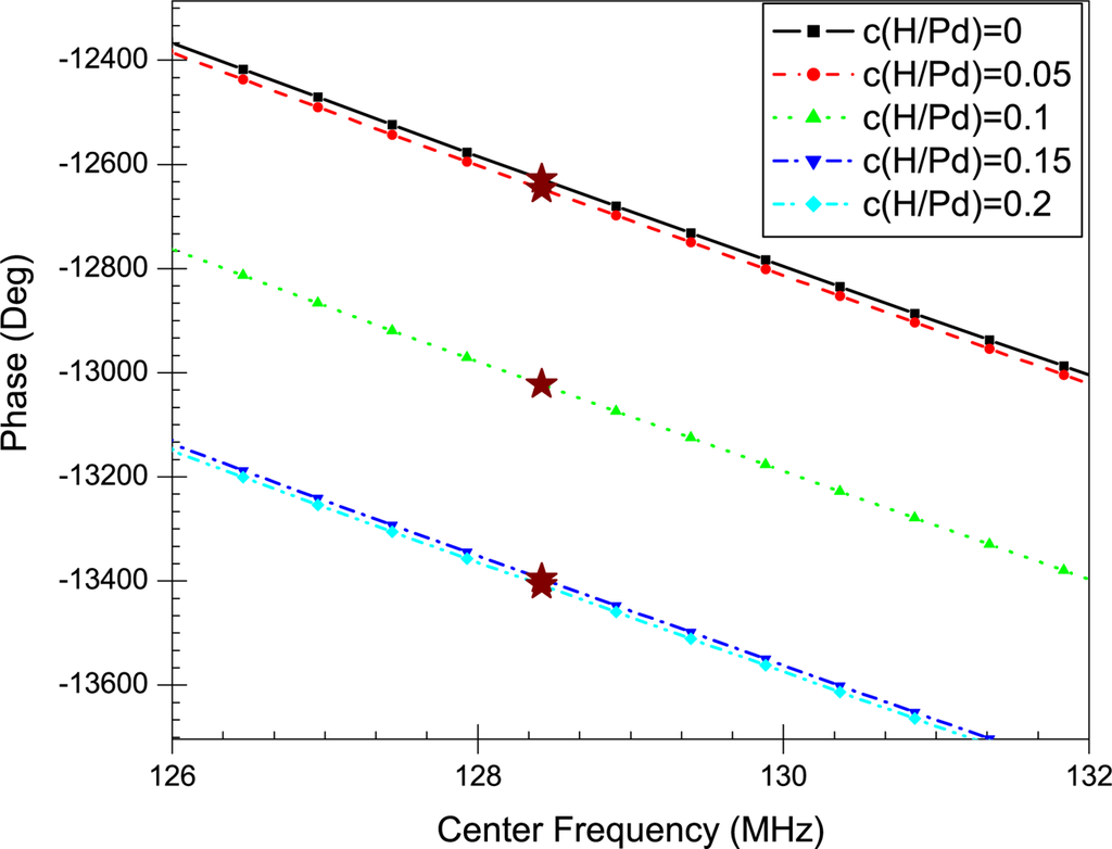 The properties of the Pd film are inserted in the model to simulate different levels of hydrogen concentrations. Figure 7 and Figure 8 show the phase profiles of the frequency response at the different concentration levels. The (⋆) sign on each phase profile illustrates the phase value of the center frequency. This is the phase value used in calculating the change in wave velocity. The normalized change in wave velocity