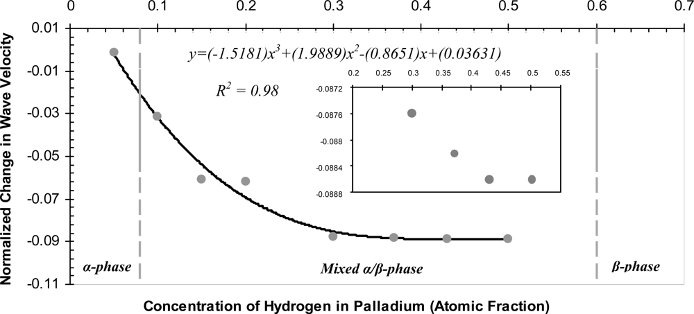 Normalized Change in Phase Velocity at Different Levels of Hydrogen Concentrations. R2 for Cubic Polynomial fit is 0.9848. Inset illustrates the Normalized Change in Wave Velocity in the Concentration Range of 0.3–0.5 a.f.