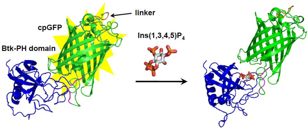 - Sakaguchi, R.; Endoh, T.; Yamamoto, S.; Tainaka, K.; Sugimoto, K.; Fujieda, N.; Kiyonaka, S.; Mori, Y.; Morii, T. A Single Circularly Permuted GFP Sensor for Inositol-1,3,4,5-Tetrakisphosphate Based on a Split PH Domain. Bioorg. Med. Chem 2009, 17, 7381–7386. [Google Scholar]