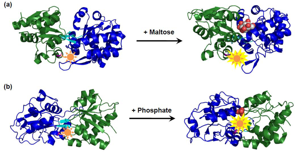 - Gilardi, G.; Zhou, L.Q.; Hibbert, L.; Cass, A.E. Engineering the Maltose Binding Protein for Reagentless Fluorescence Sensing. Anal. Chem 1994, 66, 3840–3847. [Google Scholar]