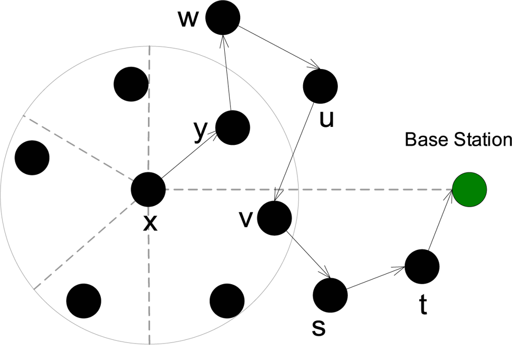 where θ is the angle between the node x and its neighboring node y with respect to the line joining node x and the base station as shown in Figure 2.