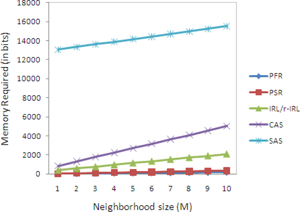 Let us assume that the sensor node has ten neighbor nodes, then the total memory required by the sensor node by the PFR, PSR, IRL, CAS and SAS is 21.25, 41.25, 260.5, 628 and 1940 bytes respectively, as shown in Figure 5.