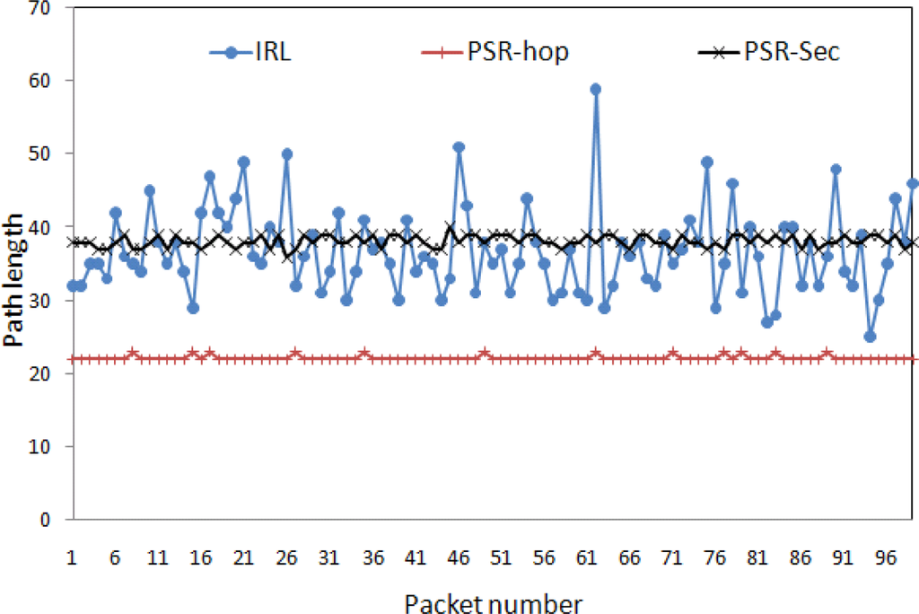 In order to analyze the path diversity behavior, we have organized 300 sensor nodes in a 10 by 30 grid manner. The rest of simulation parameters are given in Table 4. In the simulation, a single source node (ID: 224) generates 100 data packets for the base station. Figure 7 shows the path diversity (in terms of path length) of the IRL, PSR-hop and PSR-sec schemes. The average path taken by the PSR-hop, IRL and PSR-sec is 22.12, 36.81 and 38.17, respectively. It indicates that the IRL scheme incurs more delay as compared with the PSR-hop scheme and less delay as compared with the PSR-sec scheme. This figure also indicates that the IRL scheme has more path variation as compared with the other schemes, which creates more difficulties for the adversary to trace back the source from the captured packets.