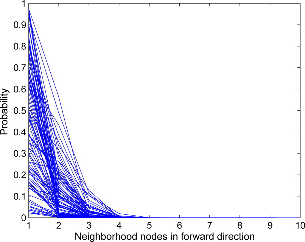where mf represents the number of nodes in the forward direction. Figure 8 shows the result of 100 simulation runs in which we have assumed that each node has equal probability to be trusted and un-trusted. It shows that, as the neighborhood size increases, the probability of the packet to move in the backward direction decreases sharply.