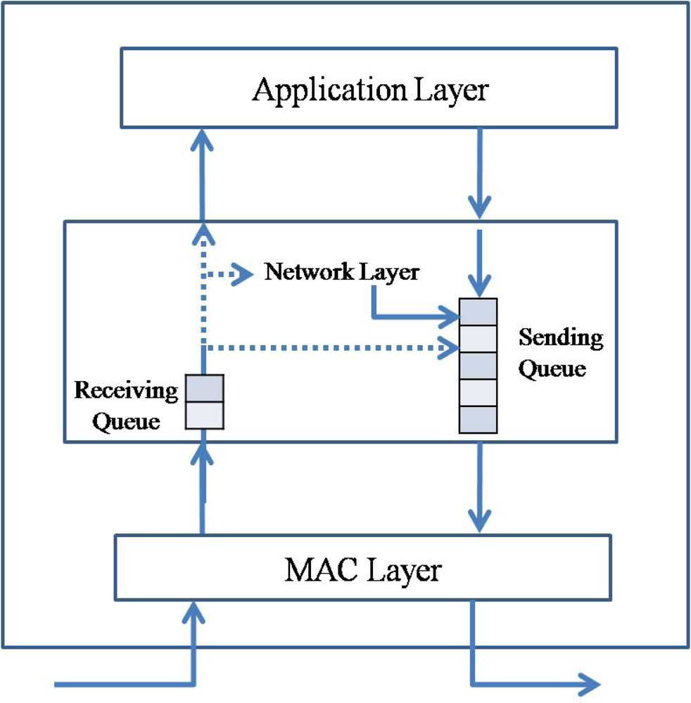 Packet flow in a sensor node. A sensor node has two queues, receiving queue for received packets and sending queue for generated packets and transit packets.