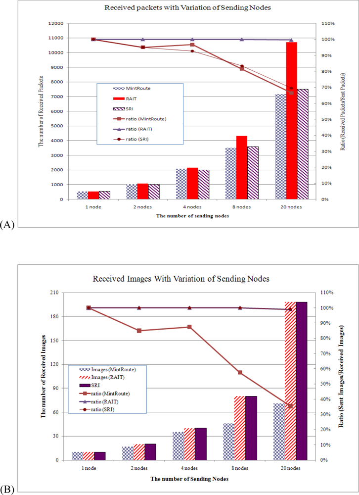 Figure 10 shows the number and ratio of received packets and images with variations in the number of sending nodes. In Figure 10 (A), bar graphs show the number of received packets with variations in the number of image-sending nodes, and the line graphs show the ratio computed by dividing the number of total received packets by the number of total sent packets. When only one sensor node sent images, MintRoute showed a 100% ratio of packet reception, but the packet reception ratio decreased even with two sensor nodes in MintRoute and SRI. As the number of sending nodes was increased, the packet reception ratio in MintRoute and SRI decreased drastically. When 20 sensor nodes were sending images, about 3,000 packets were lost, which was 33% of the sent packets. This result demonstrates that with MintRoute and SRI, many packets were lost due to network congestion caused by images. On the other hand, with RAIT, all sent packets were received by a sink node, showing a 100% reception ratio, even though the number of sending nodes was increased.