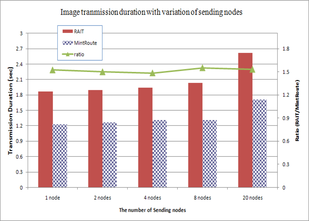 As shown in Figure 11, the image transmission duration with RAIT took 0.6 s more than MintRoute, even with one sending node. This could be analyzed as overhead of RAIT. However, this overhead does not increase with an increase in the number of sending nodes. In the case of 20 sending nodes, the duration increased up to 2.6 s with RAIT and 1.7 s with MintRoute. This amounted to about a 40% increase in both RAIT and MintRoute, showing a ratio similar to that shown in Figure 11, while the total number of transferred packets with RAIT was 33% larger than that of MintRoute, showing a large difference in the ratios shown in Figure 9. As a consequence, with RAIT, the transmission duration of an image can increase, but this would not be greatly affected by an increase in sending nodes. We might attribute this result to the effect of the preemption scheme explained in Section 3.3. With a preemption scheme in RAIT, the competition among child sensor nodes with the same parent sensor node can be greatly reduced because the preemption scheme guarantees the exclusive possession of a parent node. Given such reduced competition, the number of collisions between packets can also be decreased, and the sensor node that exclusively possesses the parent node can send successive packets without interruption or disturbance from other nodes. As a result, each packet can be transferred more quickly in RAIT than in MintRoute and SRI.