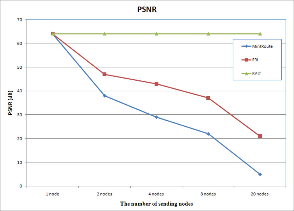 PNSR. RAIT presents uniform PSNR while PSNR of MintRoute and SRI was decreased very much.