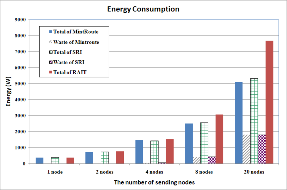 Energy Consumption. RAIT consumed more energy than SRI and MintRoute, however a large amount of energy was wasted with SRI and MintRoute.