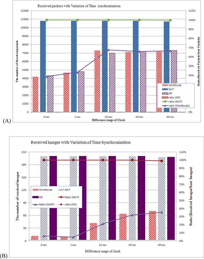 Figure 14 shows the number of received packets and images with variations of time synchronization. In Figure 14 (A), using MintRoute, only 4,200 out of 10,800 packets arrived at the sink nodes when all sensor nodes were perfectly synchronized (0 s). In this case, all of the 20 image sensor nodes simultaneously tried to send an image to a sink node, which highly increased the probability of congestion, leading to the dropping of packets in the relaying nodes. As a consequence, just 38% of the packets were received by the sink node. As the range of difference between the clocks of the sensor nodes was increased, there was an increase in the number of received packets, but when the difference between clocks exceeded 10 s, only 66% of the sent packets arrived at the sink nodes, regardless of the clock difference. In this case, even though the sensor nodes tried to send an image with a difference of 40 s in the case of little congestion among the leaf nodes, packets from several sensor nodes could cause congestion near the sink nodes. If the sensor nodes are precisely synchronized, congestion can take place around the leaf nodes of a tree while congestion can still be taking place around the sink nodes. In Figure 14 (B), with MintRoute, very few images arrived at the sink nodes when the sensor nodes were precisely synchronized. When the clock difference was 0 s, only 12 out of 200 sent images were received by a sink node, which was just 6%. In this case, we could say that most of the images were lost. Even if the clock differences were increased, the ratios of received images would be less than 40%.
