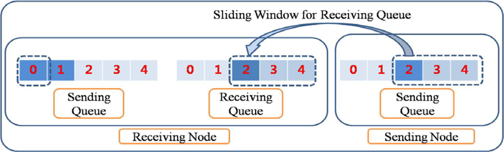 Sliding window algorithm is a method used for flow control in network transfer. A sliding window algorithm places a queue (buffer) between nodes. The sender creates a sequence number for each packet as it is transferred. Throughout the communication, it maintains the send window size so that it does not overflow. When a packet arrives in the receiver, the sliding window size for the receiving queue is decreased. When the packets in the receiving queue are retrieved by the upper network layer, the sliding window size is increased. The retrieved packets, which are delivered to the upper applications if the receiving node is the sink node, are put into the sending queue of the receiving node - provided there are available spaces in the sending queue, or they are simply dropped if the sending queue is full of packets. The sliding window for the receiving queue in RAIT functions in the same way as those in traditional networks like the Internet. Figure 2 shows an example of a sliding window for a receiving queue with a size of 5. In general, a receiving queue with a size of 1 is used in a wireless sensor network because the sensor node normally has very limited memory size.