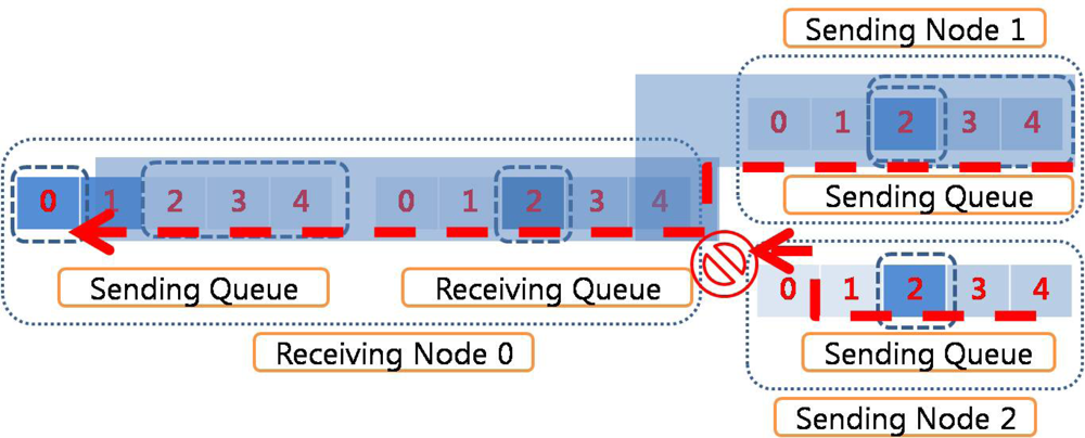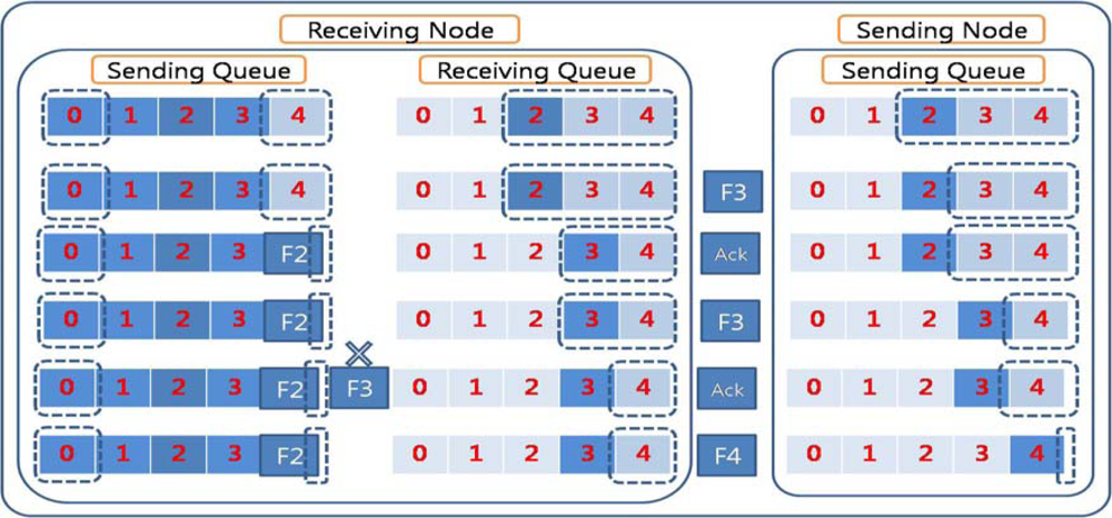 Figure 3 illustrates packet dropping due to queue overflow in the sending nodes. The receiving queue in the receiving node has enough space for the sliding window to send an ACK packet for the received packet. The sender node therefore continues to send successive packets. Because there is no space in the sending queue in the receiving node, the retrieved packets from the receiving queue are dropped. Thus, while the dropped packets need to be retransmitted, this retransmission is not easily done because ACKed packets are emitted from the sending queue. If the dropped packets were generated from the sender node, it might retransmit the packets if they were stored elsewhere, such as in an upper layer buffer, which would require additional storage space. In the case that the sender node and source node are different and the sender node is just relaying the packets, the sender cannot retransmit the dropped packets because it has emitted the packets. The source node should be notified of the fact that some packets have been dropped. Some congestion control protocols or reliable transfer protocols use this scheme. However, the sink node has to inform the source node about the packets dropped and must wait until the packets retransmitted by the source arrive at the sink node. This requires storage space in the sink node to save the received packets, as well as a time delay.