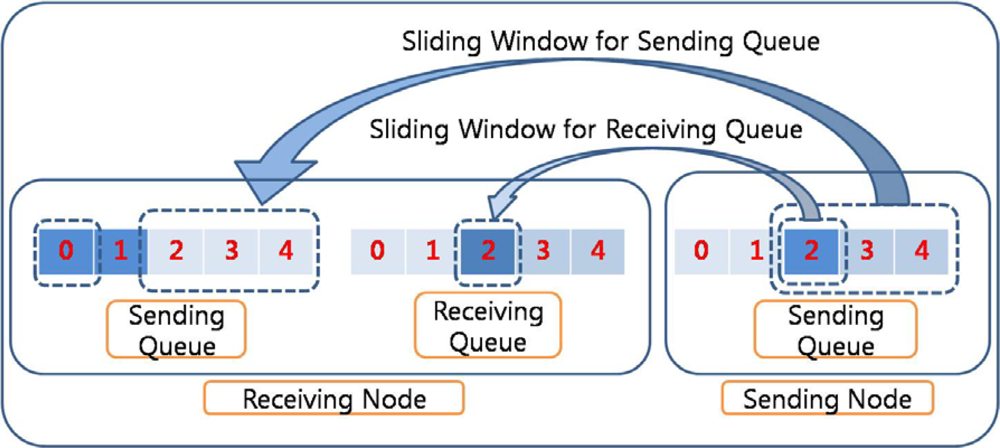 In RAIT, to prevent this effect, an additional sliding window is used for the sending queue in the receiving node, as shown in Figure 4. The sliding window for the sending queue is based on the available free space in the sending queue in the receiving node. The operation of the sliding window for the receiving queue is limited by the sliding window for the sending queue. The sender node cannot send a packet even if there are free spaces in the receiving queue in the case that the sliding window for the sending queue has reached its limit. This could prevent packet drop, as shown in Figure 3. The sliding window for the receiving queue still works with ACK packets. An ACK packet might be used for the sliding window for the sending queue, but this could cause several problems. If an ACK packet is sent after the successful insertion of a packet into the sending queue, the receiver might have to wait for an unpredictable period of time due to the processing time in the network layer of the receiving node. An ACK packet in the receiving queue is sent quite quickly so that the sender can also transmit the packet quickly. However, if an ACK packet is sent in the sending queue, more time is required, which implies that the sending rate is decreased.