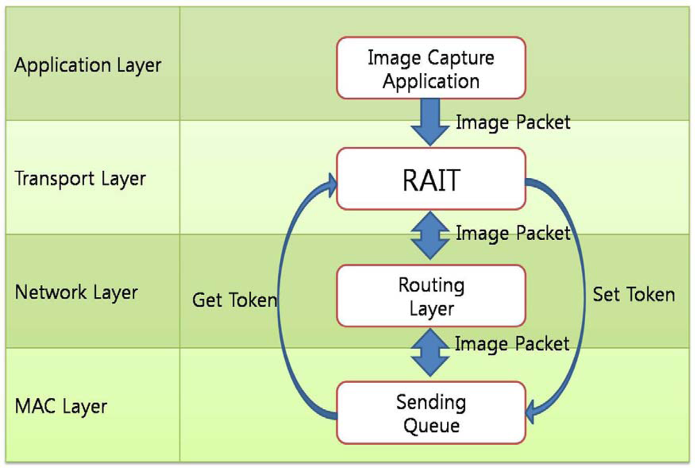 In RAIT, a token-bucket mechanism is used for the sliding window for the sending queue. The sending node requests tokens from the receiving node whenever there are packets to send but it has no token. The receiving node checks the queue state and replies to the sending node with the available queue size. The sending node controls the queue state on its own, limiting the number of packets that it can send within its token limits. However, each layer in a communication protocol layer usually operates independently and is unaware of the state of other layers, and is not allowed to control other layers directly. For this reason, the transport protocol in which RAIT works should not control the operation of the queuing layer. RAIT addresses this problem by applying a cross-layer design scheme, which is used in sensor networks on occasion. The protocol layers working in a sensor node can be tightly coupled with each other because the sensor node has very limited resources. This scheme is called Cross-Layer Design [23]. Figure 5 shows the cross-layer design in RAIT. RAIT controls the sending queue to get the available token or set the token limit.