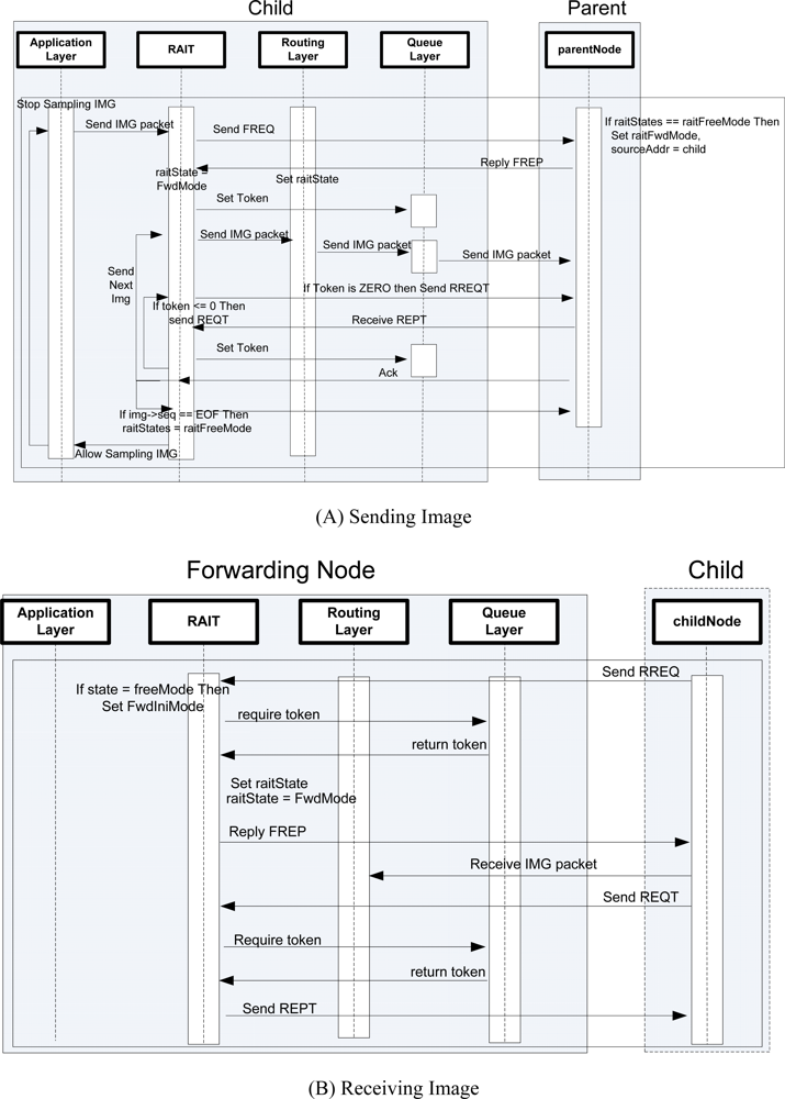 For the sliding window of the sending queue to work properly, the sending node should not change the parent node (upper node) until it consumes all the tokens received from the upper node, because the receiving node would not allow another child node (lower node) to send a packet until it receives as many packets as it has granted tokens. This means that RAIT guarantees that a sending node will transfer as many packets as it has granted tokens. In addition, RAIT also guarantees that a node will preempt an upper node, as shown in Figure 7. Here, preemption means exclusive possession. If a node is sending packets of an image to an upper node, other nodes that share the upper node with the sending node (child nodes of the receiving node), should wait for the sending node to complete sending all the packets of an image. For example, in Figure 7, node 0 is a parent of node 1 and node 2. If node 1 is sending packets to node 0, node 2 has to wait for node 1 to complete all its packets. If the size of the sending queue in the sensor node is smaller than the image size, then an image would occupy several nodes at once. For example, if a sensor node has a queue that is size 10 and an image that consists of 30 packets, then the image would occupy 3∼4 sensor nodes.