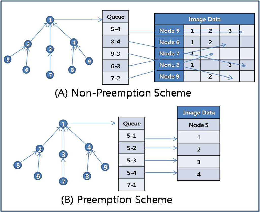 The preemption scheme in RAIT can reduce the necessary memory spaces in the sink node that collects and arranges image packets received from the sensor nodes. If a non-preemption scheme is used in which sensor nodes compete to send a packet to a parent node, the sink node has to allocate memory space according to the number of sensor nodes, as shown in Figure 8 (A), because packets from several sensor nodes have arrived at the same time. Moreover, packets from a sensor node could arrive at a sink node in a sequence different from their original sequence, because packets would be transferred through multiple paths if the sensor nodes frequently change their parent node in a non-preemption scheme. In this case, a packet could arrive at a sink node earlier than other packets with a higher sequence number, so that a sink node would have to distinguish between a delayed packet and lost packet. For example, in Figure 8 (A), a sink node receives packets 1 and 3, skipping packet 2 from node 8. In this case, the sink node has to distinguish whether packet 2 has been lost somewhere or has just been delayed. The sink node has to wait for packet 2 for an uncertain period of time, and if it does not arrive in that time, then the sink node can regard packet 2 as lost. The problem is that it is hard to define the waiting time for a delayed packet. Even more serious is the problem of how to treat a lost packet. If the sink node disregards the lost packet, then the quality of the image would be degraded to the extent of the information in the lost packets. If the sink node requests that the source node of the lost packet retransmit the lost packets, then the sink node must wait for the retransmitted packet to arrive, while storing the received packets somewhere in memory. This would require additional memory spaces for the delayed collection of the image [26].