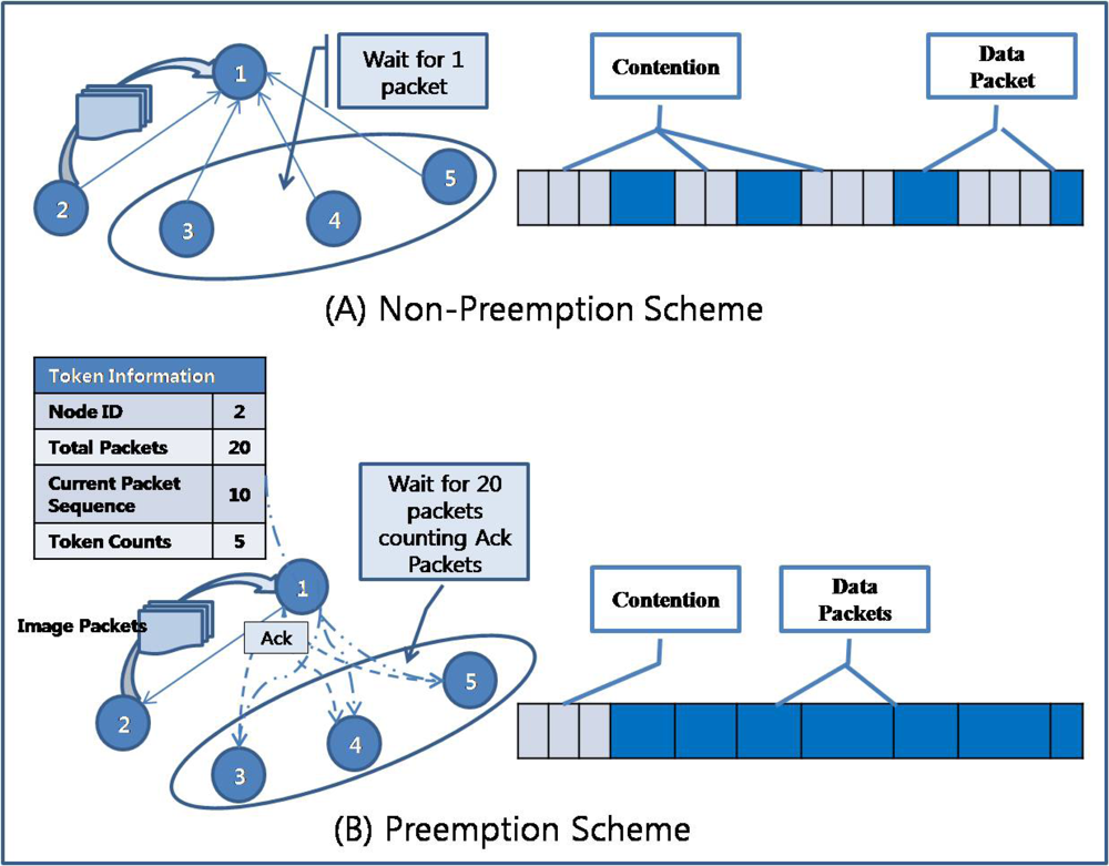 On the other hand, with a preemption scheme, if a sensor node is sending packets of an image, other sensor nodes that have the same parent node can know how many packets the sending sensor node is sending due to token information sent by the parent node. A token packet from a parent sensor node consists of the following information: Node ID (sending node), Total Packets, Current Packet Sequence, and Token Counts. All the child sensor nodes of the parent sensor node can receive the token packet that is broadcast by the parent sensor node, and thus the other sensor nodes can know who is sending, how many packets are being sent, and how many packets remain. These other sensor nodes will therefore wait for all the packets of an image to be transferred, not a single packet, because RAIT guarantees exclusive possession of the parent node. This means that other sensor nodes do not need to check the channel for a carrier signal, which in turn means reduced competition for a channel. Instead, these sensor nodes will listen for an ACK packet from the parent node, which sends an ACK packet whenever it properly receives a packet from a child sensor node. By counting the received ACK packets, other sensor nodes can know how many packets have been sent and how long they will need to wait. For example, as shown in Figure 9 (B), if sensor node 2 is sending 20 packets to parent sensor node 1, the other sensor nodes (sensor nodes 3, 4, 5) will wait for sensor node 2 to finish transferring 20 packets by counting until 20 ACK packets have been received. As a consequence, sensor nodes with a non-preemption scheme compete for the communication channel for a packet, whereas sensor nodes with a preemption scheme compete for the communication channel for an image.
