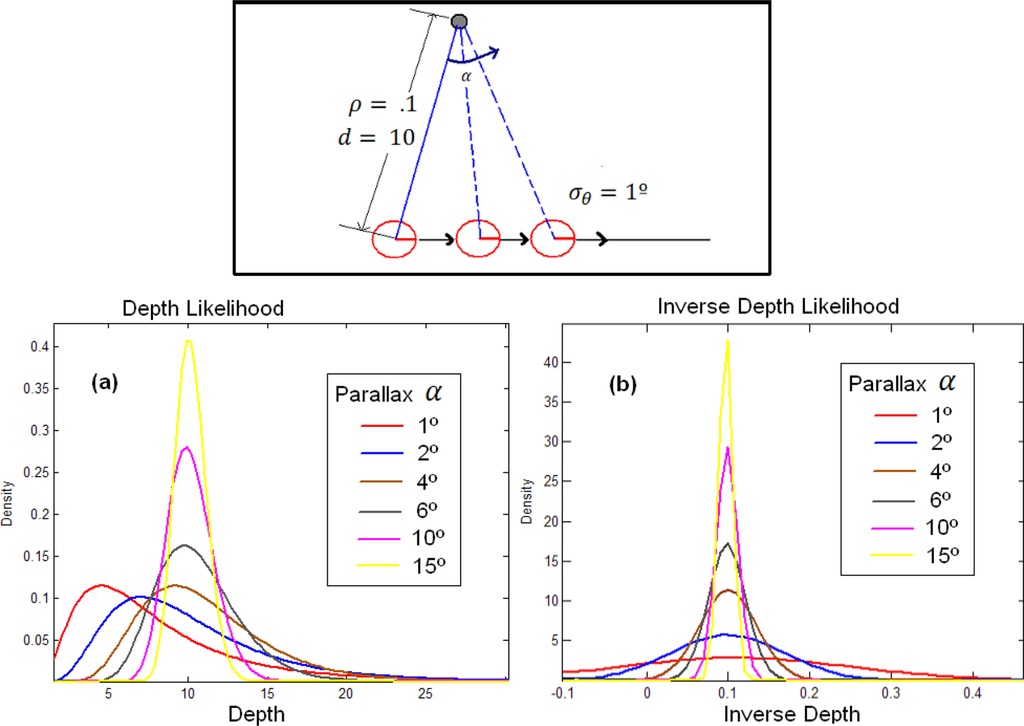 Figure 2 shows a simulation for a point reconstruction from noisy bearing measurements at different parallax (upper plot), using both, the Euclidean and the Inverse Depth parameterization. The location of the vehicle is known. A Gaussian error σθ = 1° (degrees) is introduced in bearings. Lower plots show the evolution of the likelihood for depth and inverse depth as the parallax in the observation grows: in (a), the estimates of depth likelihood converge to a Gaussian-like shape, but the initial estimates are highly non-Gaussian, with heavy tails. In contrast, likelihoods of inverse depth (b) (abscissa in inverse meters) are nearly Gaussian, even for low parallax. Therefore it can be clearly appreciated how the uncertainty can be represented by a Gaussian using the inverse depth parameterization over whole parallax range, whereas the Euclidean representation converges to a Gaussian-like shape only to the final estimates. For the Euclidean representation, the parallax needed for the likelihood converges to a Gaussian-like shape, depending on the sensor noise, and thus the noisier the sensor the more parallax is needed for convergence.