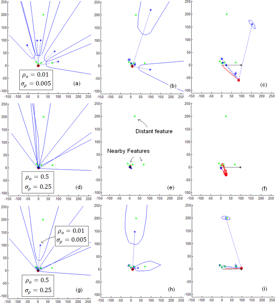 Figure 3 illustrates the SLAM process using the ID-Undelayed following a simple straight trajectory for 5 features, (4 of them near to the vehicle and the other more distant). In upper plots (a,b and c) the initial parameters (ρo = 0.01, σρ = 0.005) are set in order to initialize the features at the middle of the distance between the vehicle and the more distant feature, and therefore far enough respect to the nearby features (plot a). In this case we found in almost every case a huge drift in the estimates (plot c), and it can be appreciated that initializing the features far away from the sensor fails if there are some closest landmarks. If other values (ρo = 0.5, σρ = 0.25) are used (near to the sensor), (central plots d, e and f) then the percentage of convergence is poor (approx 50%) (plot f), due to the influence of the distant feature. In this case if the distant feature is removed from the map (not illustrated here) then a percentage of convergence of 80% is achieved. In the last series (lower plots g, h and i) we combine both initial values: ρo = 0.01, σρ = 0.005 for the distant landmark and ρo = 0.5, σρ = 0.25 for the all the nearby ones. In this case an effectiveness of 90% was achieved for the algorithm.