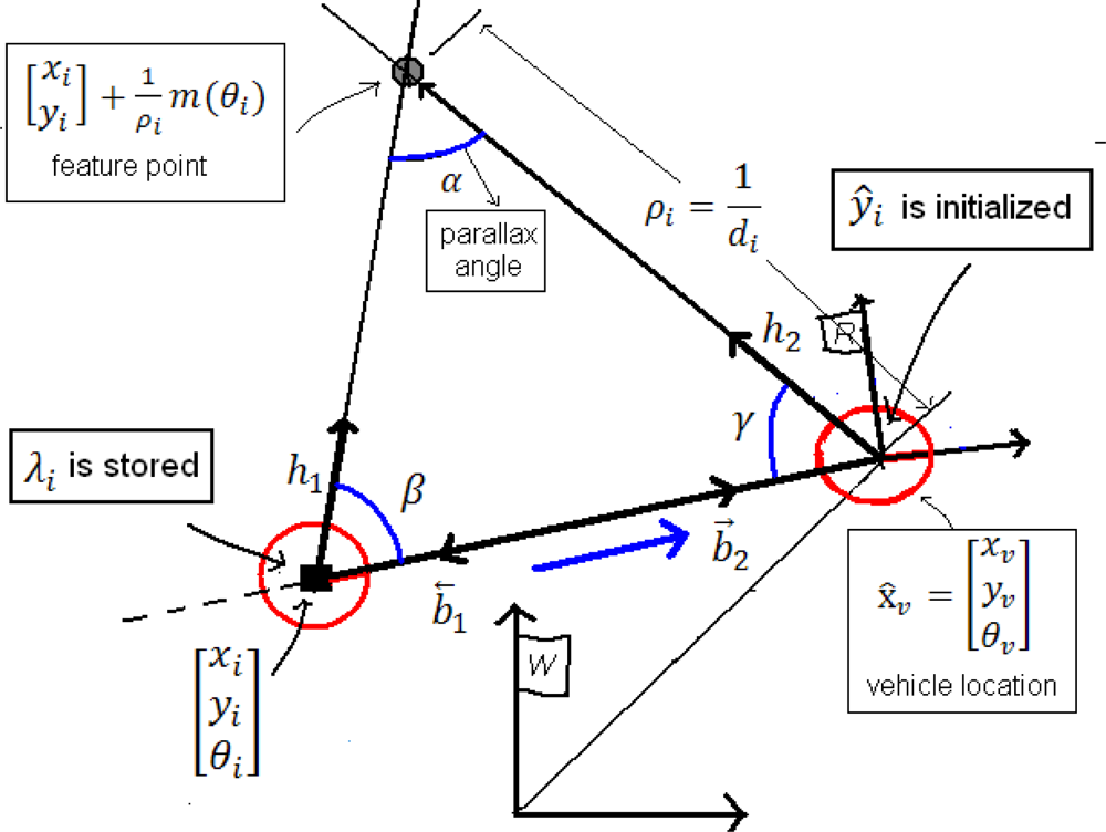 For each candidate point λi, every time that a new bearing measurement z is available, the parallax angle α can be estimated as (Figure 4):