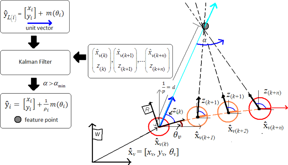 A minimum parallax threshold αmin is used for updating a feature ŷL(i) as ŷi. Distant features will not produce parallax and therefore will remain expressed as ŷL(i), but contributing to the estimation of sensor orientation θv.