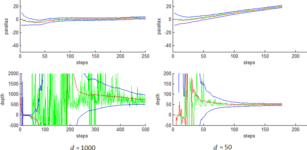 The state x̂can encloses the parallax αi and inverse depth ρi estimations for each feature ŷL(i). Figure 6 shows the evolution of parameters αi (upper plot) and d = 1/ρi (lower plot) and its uncertainty for the feature estimated by the linear Kalman filter, (left plot) feature at a distance of d = 1,000 units and (right plot) for a distance of d = 50 units. The boundary uncertainties at 3σ are indicated in blue color. The filtered values are depicted in red color. Also note in green color the raw measurements zcan (taken from Equation 26). In these graphics it can be clearly appreciated how the estimation of depth d is directly influenced by the parallax; for the near feature, about 100 steps are needed to producing parallax and thus d converges rapidly to its real value. Also note that the uncertainty is rapidly minimized. On the other hand, the distant feature produces small parallax. For a low parallax the sensor noise predominates and therefore produces very fluctuant raw measurements. Even so, after several steps, the filter estimates the depth reasonable well with a high related uncertainty.