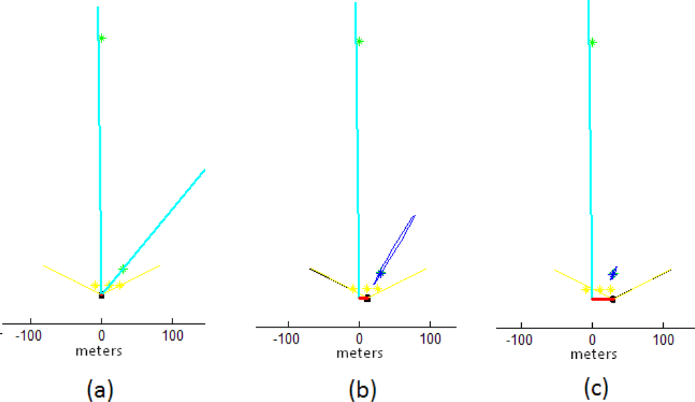 Figure 7 shows the evolution in the initialization process of two features maps with the concurrent initialization: a distant one (600 units of depth) and a near one (50 units of depth). The only information given a priori to the system was the scale reference (the three points in yellow) which was introduced with an associated uncertainty close to zero in the covariance matrix R. Taking into account that there is not an additional sensory input (e.g., odometry), at every step an unknown linear and angular acceleration is introduced with zero mean and known-covariance Gaussian processes (Section 3.1). In this case, aWx = 4 m/s2, aWy = 4 m/s2 and aWθ = 2 rad/s2 were used. The only input sensor of the system is a noisy sensor capable of measuring the bearing of features, with a limited field of view of 110° (emulating a 2-DOF camera). A standard deviation of σ = 1° is considered for the sensor readings.