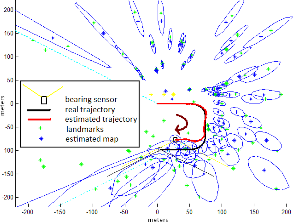 Figure 8 illustrates the environment setup used in the study. For all the tests, the bearing sensor is moved over a semi-cycled U-like shape trajectory, since our main goal is to observe the effect of the initialization process of new features in the estimation of both map and sensor location, instead of the closing loop problem. About 100 landmarks (in green) simulate the environment of the sensor. Figure 8 also shows both the map and sensor trajectory estimates after a single run of 2,000 steps of the Concurrent method. The features map and their uncertainties are indicated in blue. Note the evolution of uncertainty in both sensor and features location. Also note the typical (in SLAM systems) drift in both trajectory and map estimations as the sensor moves far away from its initial location.