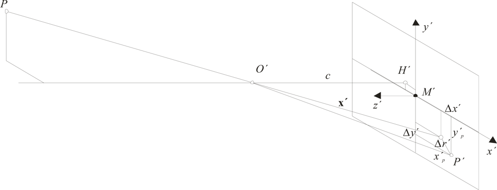 Deviations from the ideal central perspective model, attributable to image errors, are expressed in the form correction functions Δx′, Δy′ with respect to the measured image coordinates. In the first instance, measured image coordinates x′p, y′p are corrected by an offset of the principal point x′0, y′0:
