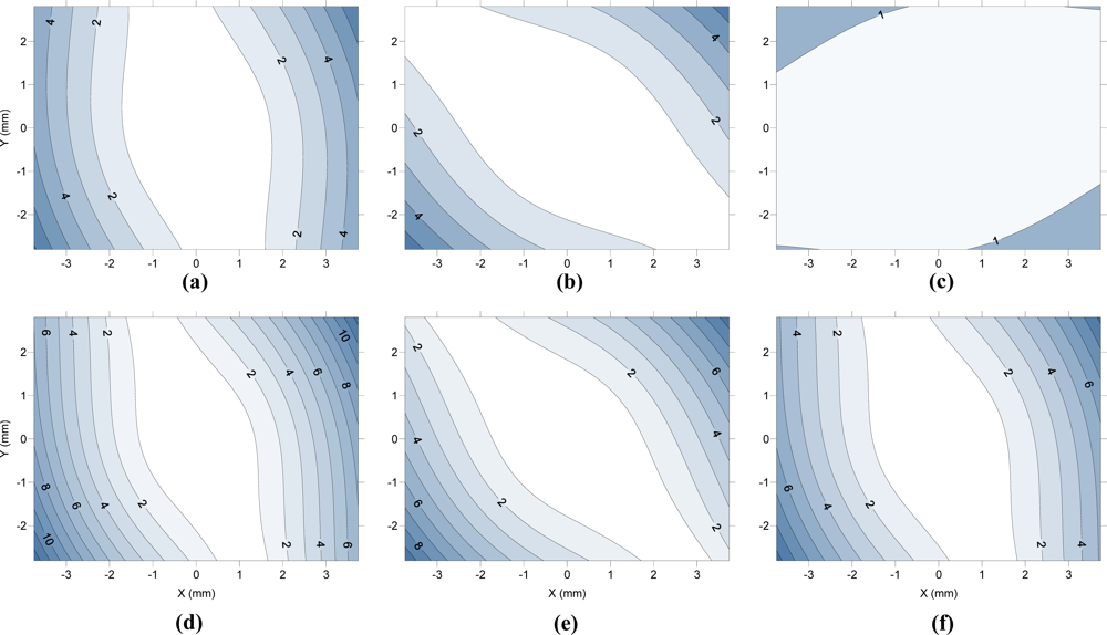 Tangential component of the decentering distortion (in microns) in cameras A (a), B (b), C (c), D (d), E (e) and F (f).