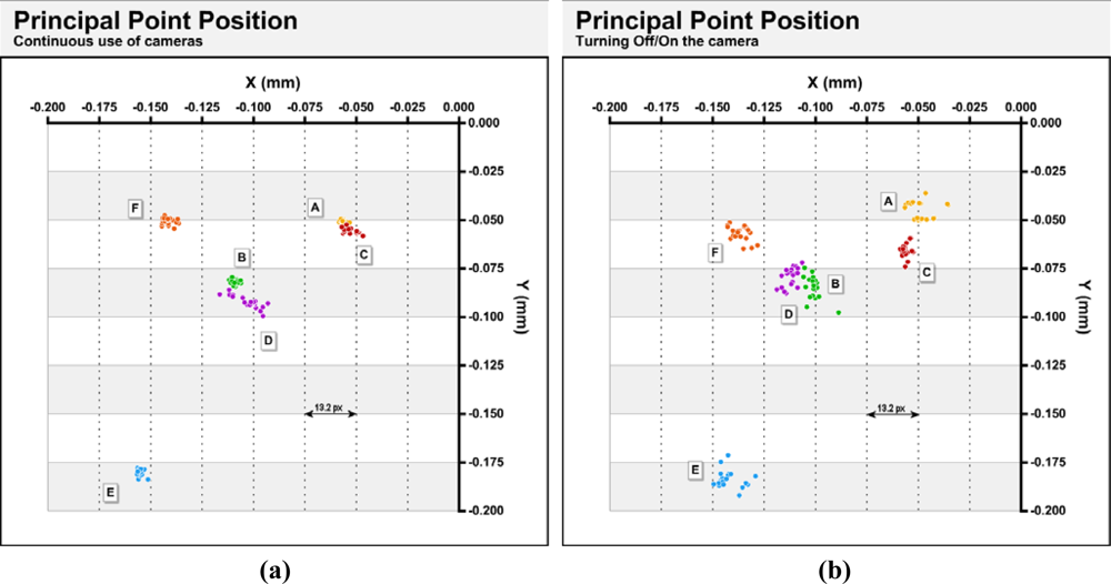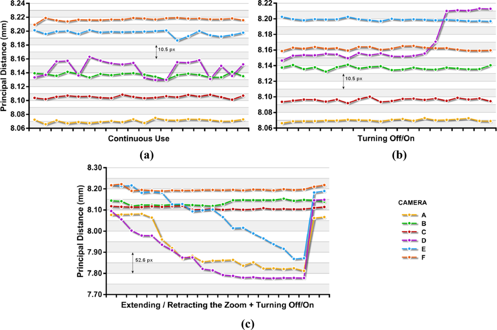 In all cases for continuous use and power cycling, all cameras except unit D appeared to be stable with standard deviations in their principal distance smaller than 5 μm (2.6 px). These deviations represent less than 0.07% of nominal focal length (7.90 mm). It is noteworthy that the deviations obtained in the off/on tests in four of the cameras are less than those obtained for continuous use tests, although the differences were very small.