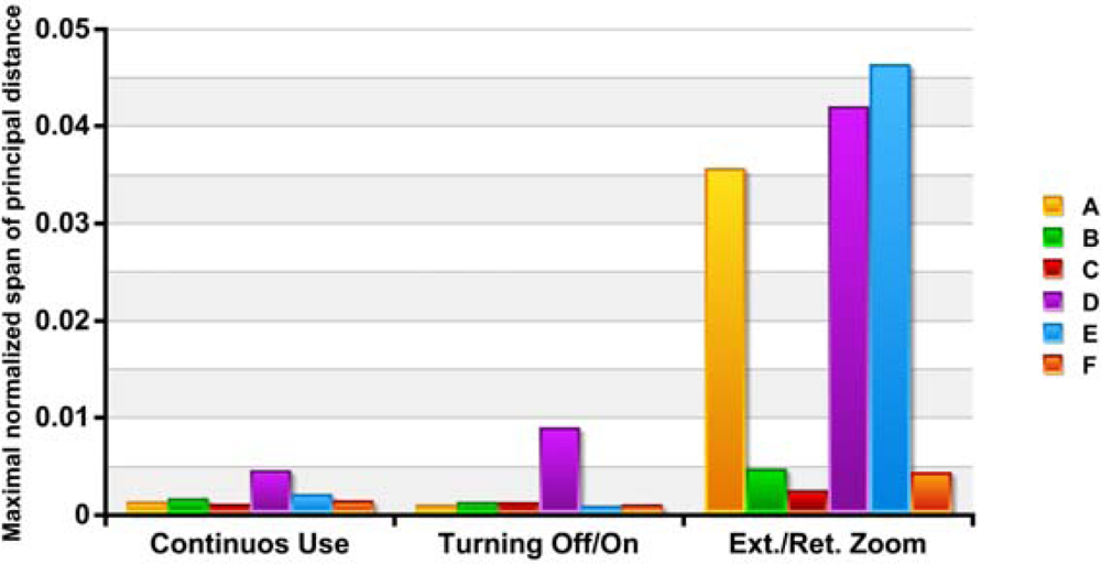 Figure 4 shows the changes in principal distance refer to the image width: (cmax − cmin) / w. The values obtained in continuous use and with applying off/on cycles, with the exception of camera D, are the same order of magnitude as those cited for Läbe for a Sony DSC V1 with 1x zoom factor [].