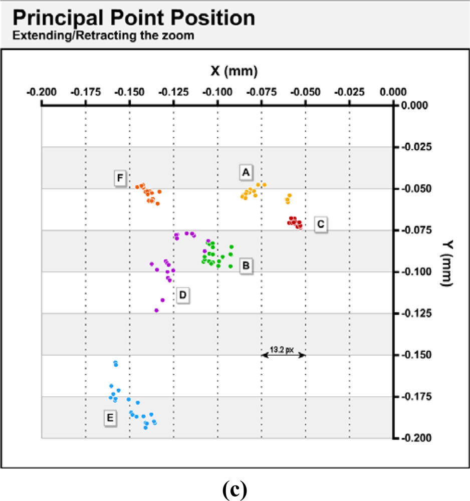 Figure 5 shows the variations found in the principal point’s positions for the three situations described in section 3.2; continuous use (a), power cycling (b) and extending/retracting the zoom lens (c). In the figure, the origin coincides with the geometric center of the sensor.