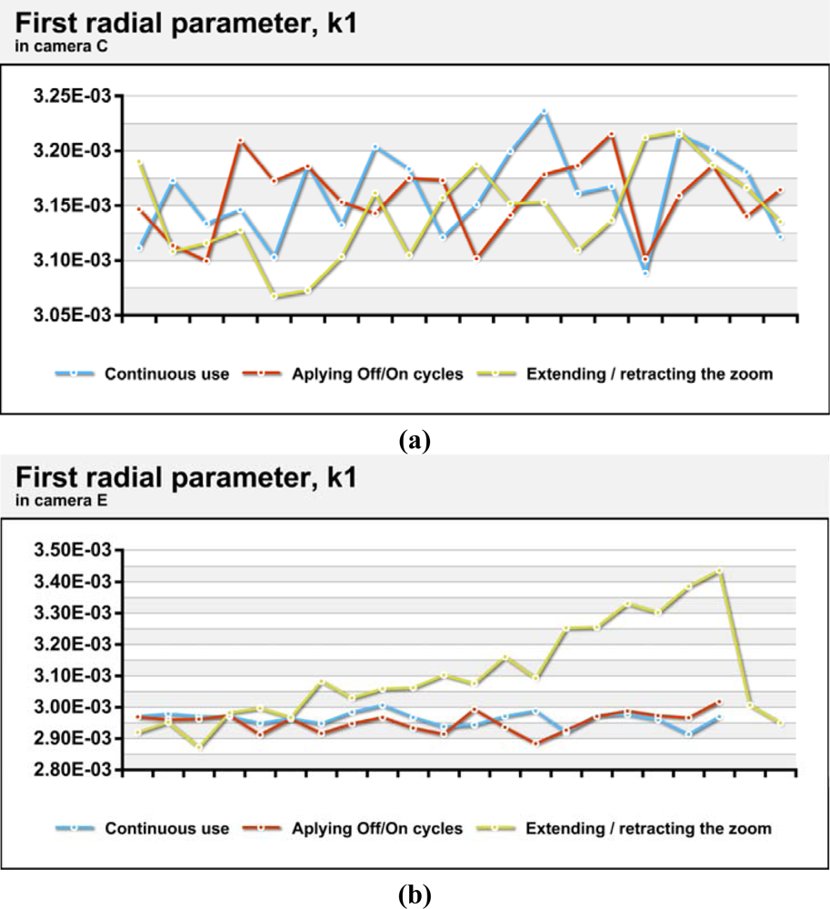 Figure 6 (a) shows the variations in the first coefficient of radial distortion in camera C, a camera with more stable geometry. In contrast, Figure 6 (b) shows the variations in camera E, as an example of the most geometrically unstable camera among those tested. As seen in the values from camera C, there are no strong trends in the data and the maximum range is less than 5% even for calibrations performed after cycles of extension and retraction of the zoom. In the camera E tests, differences between the maximum and minimum values are up to 20% for calibrations performed after cycles of extension and retraction of the zoom. This is due to the systematic nature of the difference, analogous to the differences in principal distance. The standard variations in the value of the first parameter of radial distortion in situations of continuous use and power cycling are approximately 3 × 10−5 (Table 5), which represents 1% relative variation on the mean, a high value but logical given the high correlation between the different parameters of distortion. Camera D showed variations which were significantly higher. Cameras with systematic variations in geometry during extension/retraction of the zoom (D, E and F) reached differences that were over 15% of the average value.