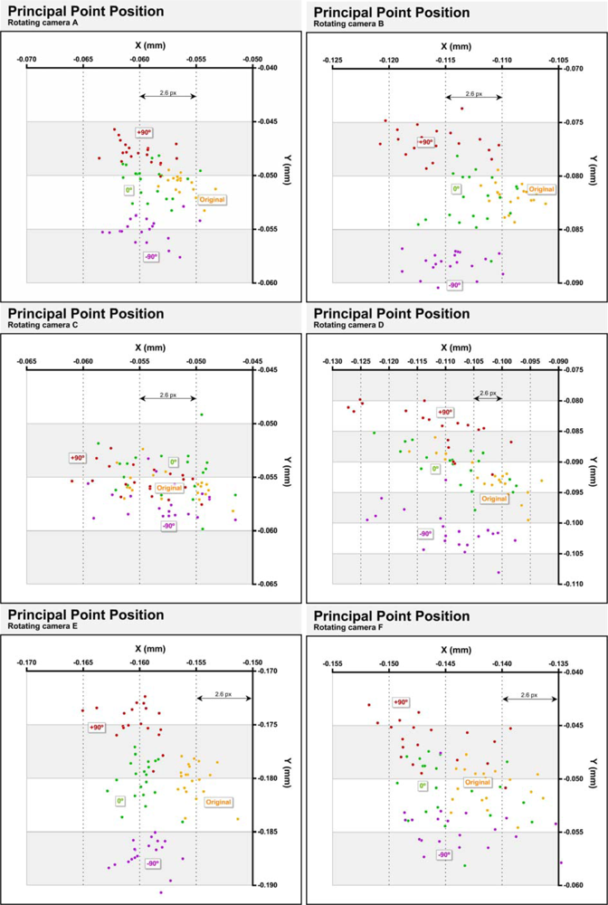Figure 7 compares the positions of the principal point in four cases and the six cameras tested. The 20 yellow dots correspond to the positions calculated using the full photogrammetric network explained in paragraph 3.1, with 12 photographs. These points are, therefore, the same as in Figure 5. The green dots are the positions of the principal point obtained from the subset of photographs consisting of the four photographs taken with the camera sub horizontal plus two photographs taken with the camera rotated 90° and −90°. Items in red are the positions obtained from the subset of photographs consisting of four photographs taken with the camera rotated 90° clockwise plus two opposite photographs taken with the camera sub-horizontal. The purple dots indicate the positions of the principal point calculated from the subset of photographs consisting of four photographs taken with the camera rotated −90° plus two photographs taken with the camera sub-horizontal.