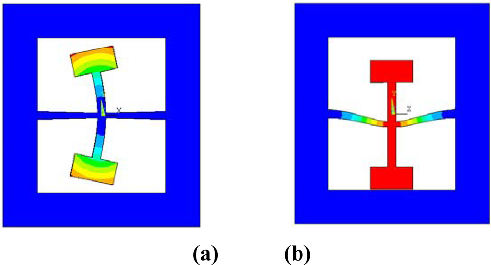 - A pair of sense electrodes is formed on the sidewalls of the sense beam independently. This electrode layout is easy to be prepared by aperture masks.