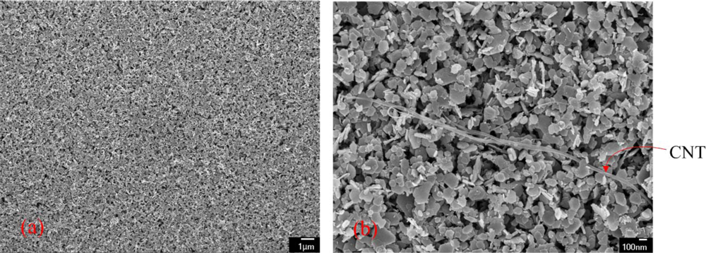 SEM images of the CoOOH/CNT film; (a) low magnification; (b) high magnification.
