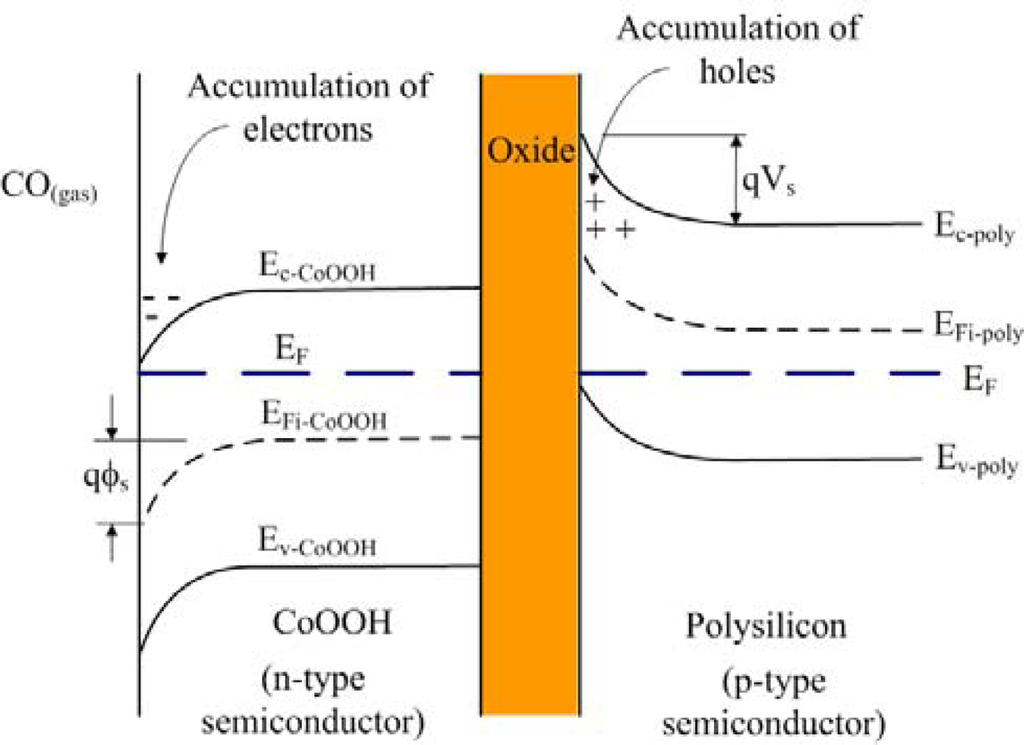 where * represents the active sensing vacant sites on the surface and CO–*− is the absorbed CO on the surface. Figure 4 illustrates the energy band diagram of the CO sensor. The cobalt oxide is an n-type semiconductor, and the polysilicon is p-type. When the surface of CoOOH is exposed to CO gas, electrons are produced at the surface of CoOOH according to Equation (2). As shown in Figure 4, an accumulation of electrons is formed at the surface of CoOOH when CO gas interacts with CoOOH, so that the conduction and valence band edges of CoOOH bend downward, resulting in generation of a negative surface potential, ϕs. An accumulation of holes at the oxide-polysilicon interface is formed by the negative surface potential ϕs, which leads to the conduction and valence band edges of polysilicon to bend upward and causes the production of the potential barrier, Vs [21]. When the CoOOH film of the CO sensor is in a high CO environment, the surface potential ϕs increases, resulting in an increase of the potential barrier Vs and a decrease of the polysilicon resistance. Therefore, the resistance of polysilicon increases as the amount of CO sensed by the CoOOH increases.