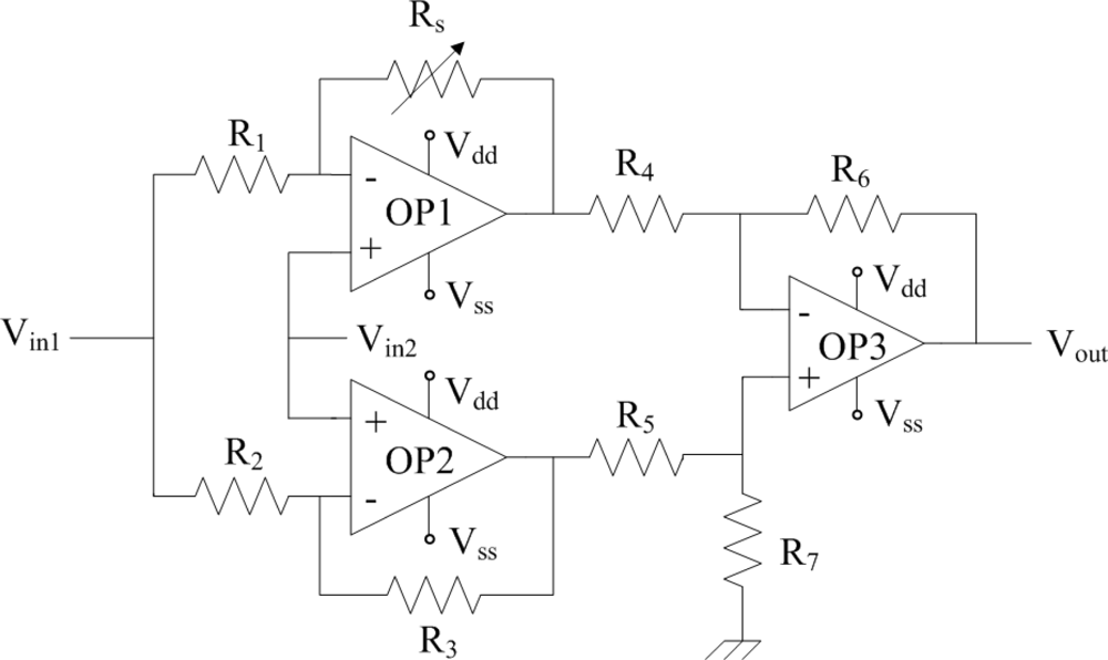 Figure 5 illustrates the readout circuit for the CO sensor, where Rs represents the resistance of the sensor; Vdd is the bias voltage of the circuit; Vss is the ground; Vin1 and Vin2 are the input voltages of the circuit and Vout is the output voltage of the circuit. The readout circuit contains three amplifiers, where OP1 and OP2 are non-inverting amplifiers; OP3 is a difference amplifier. The resistance of the sensor changes as the sensing film adsorbs or desorbs CO gas. The readout circuit is employed to convert the resistance of the CO sensor into the voltage output. In this design, R1=1 kΩ, R2=1 kΩ, R3=10 kΩ, R4=100 Ω, R5=100 Ω, R6=15 kΩ and R7=20 kΩ are adopted. HSPICE, which is a professional circuit simulation software, is utilized to simulate the characteristics of the readout circuit.