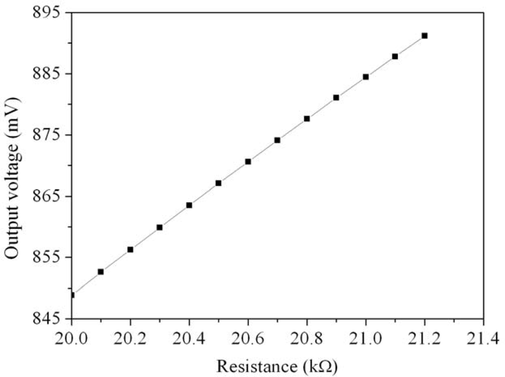 Figure 7 presents the relation between the output voltage of readout circuit and the resistance of sensor. In this investigation, the input voltages Vin1 and Vin2 are 3 V, the resistance of the sensor changes from 20 to 21.2 kΩ. The output voltage of the readout circuit changes from 850 to 890 mV as the resistance of the sensor varies from 20 to 21.2 kΩ.