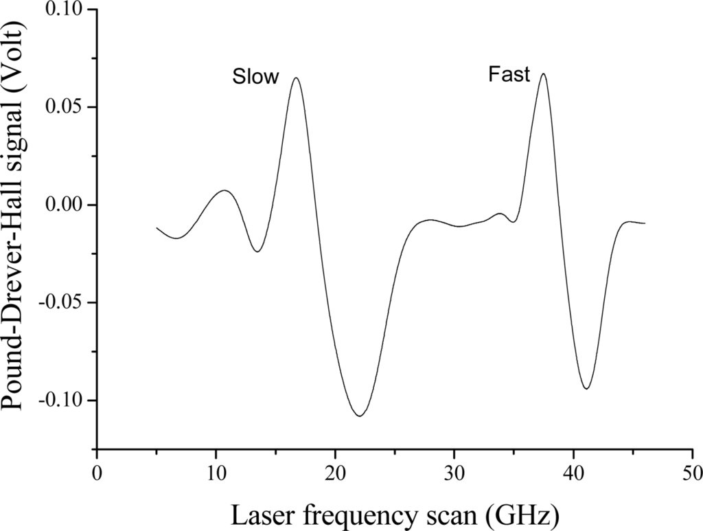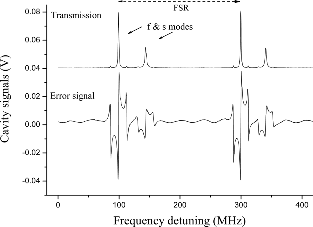 Narrow laser frequency scan equivalent to about one cavity free spectral range (FSR) with RF sidebands at 12 MHz (upper graph). Two peaks appear well separated in frequency by 50 MHz. The PDH signals are also recorded for both polarization eigenmodes.
