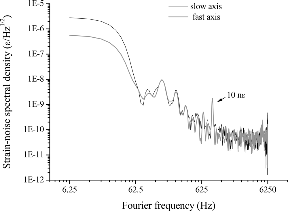 Response to dynamic strain of fast and slow axes cavity modes in laser-locked condition for a 10 nε signal applied to the intra-cavity fiber.