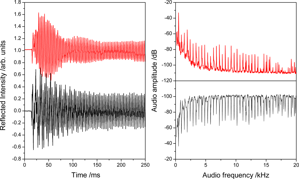More recently we used a Fabry-Perot cavity made of two identical FBGs that were placed 10 mm apart to obtain sound recordings at higher sensitivity and lower noise. The FBG cavity (QPS Photronics, Montreal, QC) was deliberately made to have a very low finesse (F < 5) as is clearly apparent from the inset of the cavity reflection spectrum (Figure 17). A DFB laser (QPS Photronics) was current (temperature) tunable and was periodically reset to a wavelength near the mid-reflection point of a cavity fringe. Light from the laser was directed to the FBG cavity which was fixed onto the soundboard of the guitar with adhesive tape. The reflected light was directed by a fiber optic circulator into a photodetector. The photodiode signal was amplified and sampled using an audio preamplifier (Edirol UA-25EX). Figure 18 shows the first 250 ms of a 10 s time evolution of the transmitted light signal and the PZT response as the guitar’s E4 string is plucked. The Fourier transforms of the entire PZT and FBG transducer recordings show the fundamental frequency of the E4 note (here slightly mistuned to 326.8 Hz) as well as its harmonics up to the 25th overtone at 8,171 Hz. Both transducers could reproduce frequencies higher up to 22 kHz with the FBG transducer exhibiting a lower noise floor. The difference in their frequency response is partly due to the different position on the guitar body.