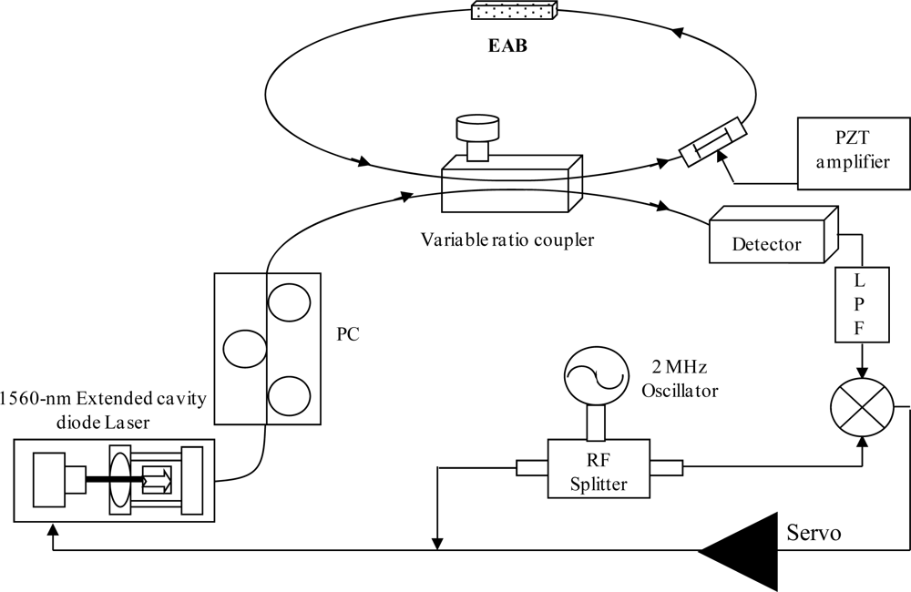Schematic of the fiber-ring resonator. PC: polarization controller; EAB: evanescent-access block; LPF: low-pass filter.